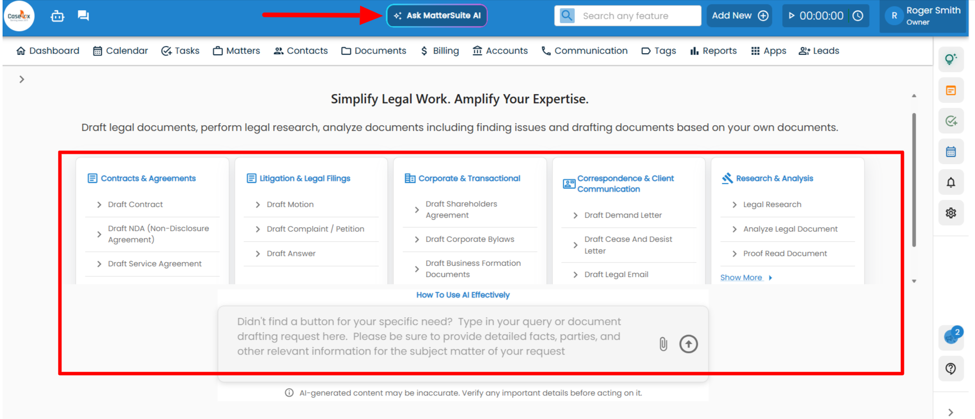 You can access this feature directly from your dashboard by clicking “Ask MatterSuite AI”.