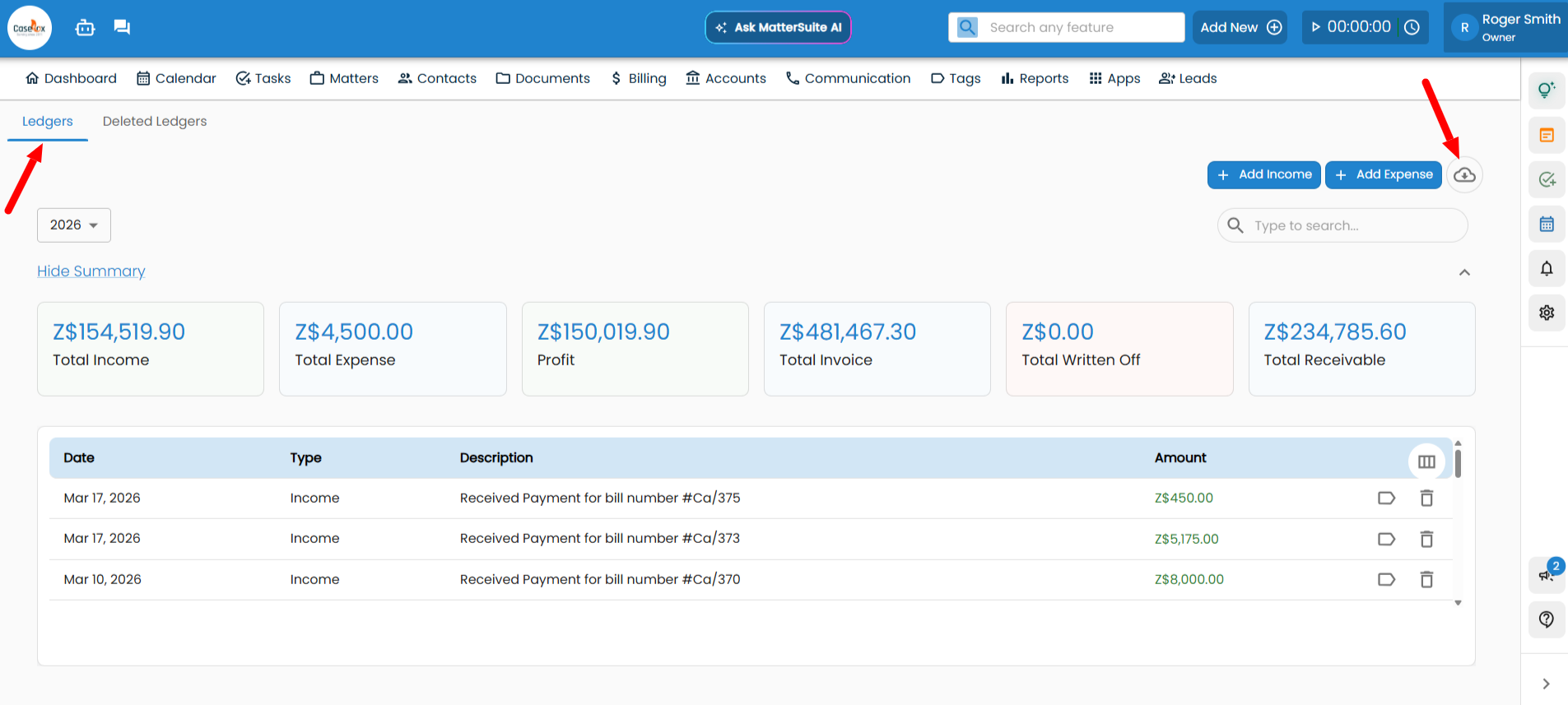 1. Go to your MatterSuite Dashboard. 2. Click on the Matters section. 3. Click the Export Matters icon located in the top-right corner. 4. Your data will be automatically downloaded as an Excel or CSV file. Refer to the image below