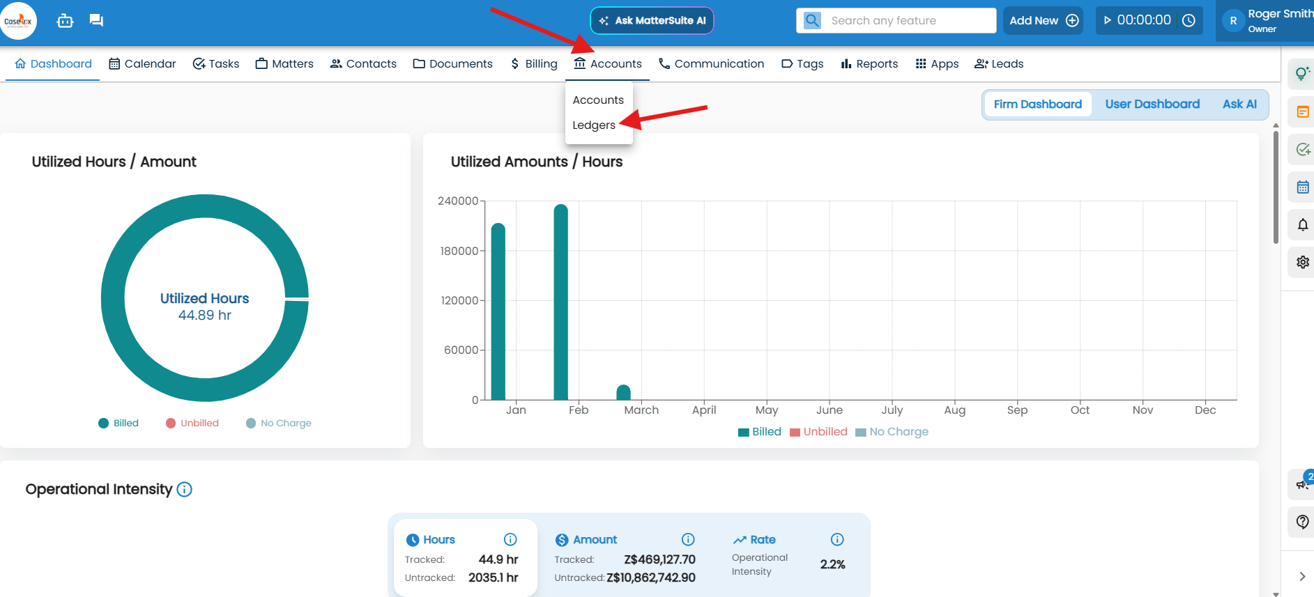1. Hover over the Accounts tab and select Ledgers from the menu.