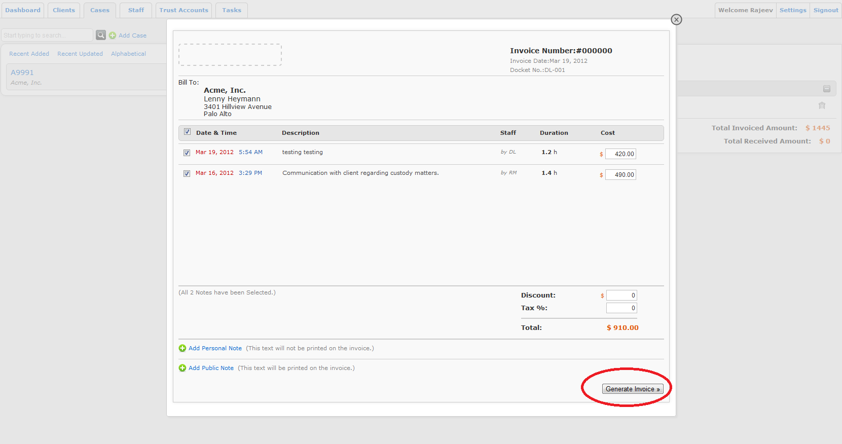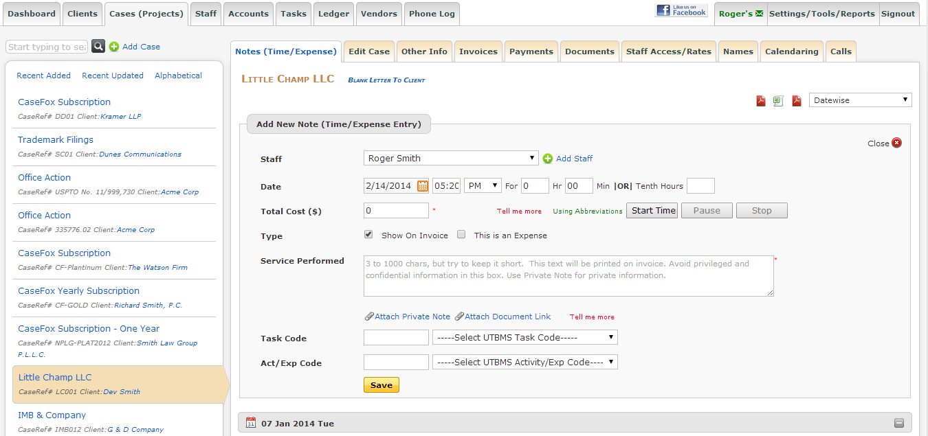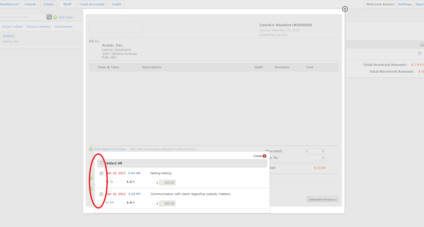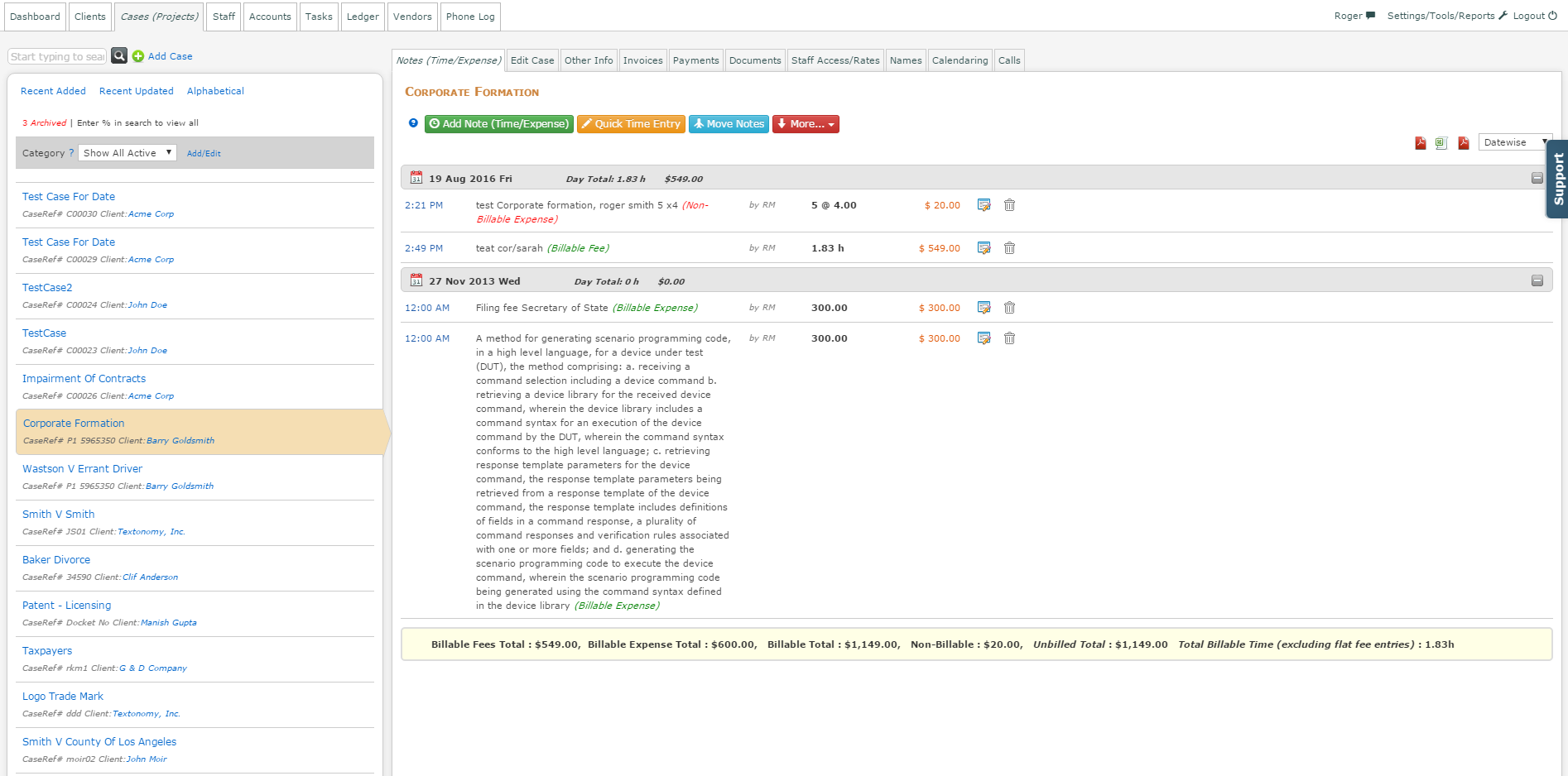 2. Click on "Cases" tab, select a case in the left panel bar. Then scroll down to the bottom on the rightside note listing. If you see an amount in "Non-Billable" category, you should review your time/expense entries. You may have not checked [ ] "Show on Invoice" checkbox in one or more notes. Of course, it is ok if you intentionally unchecked the "Show on Invoice" checkbox.