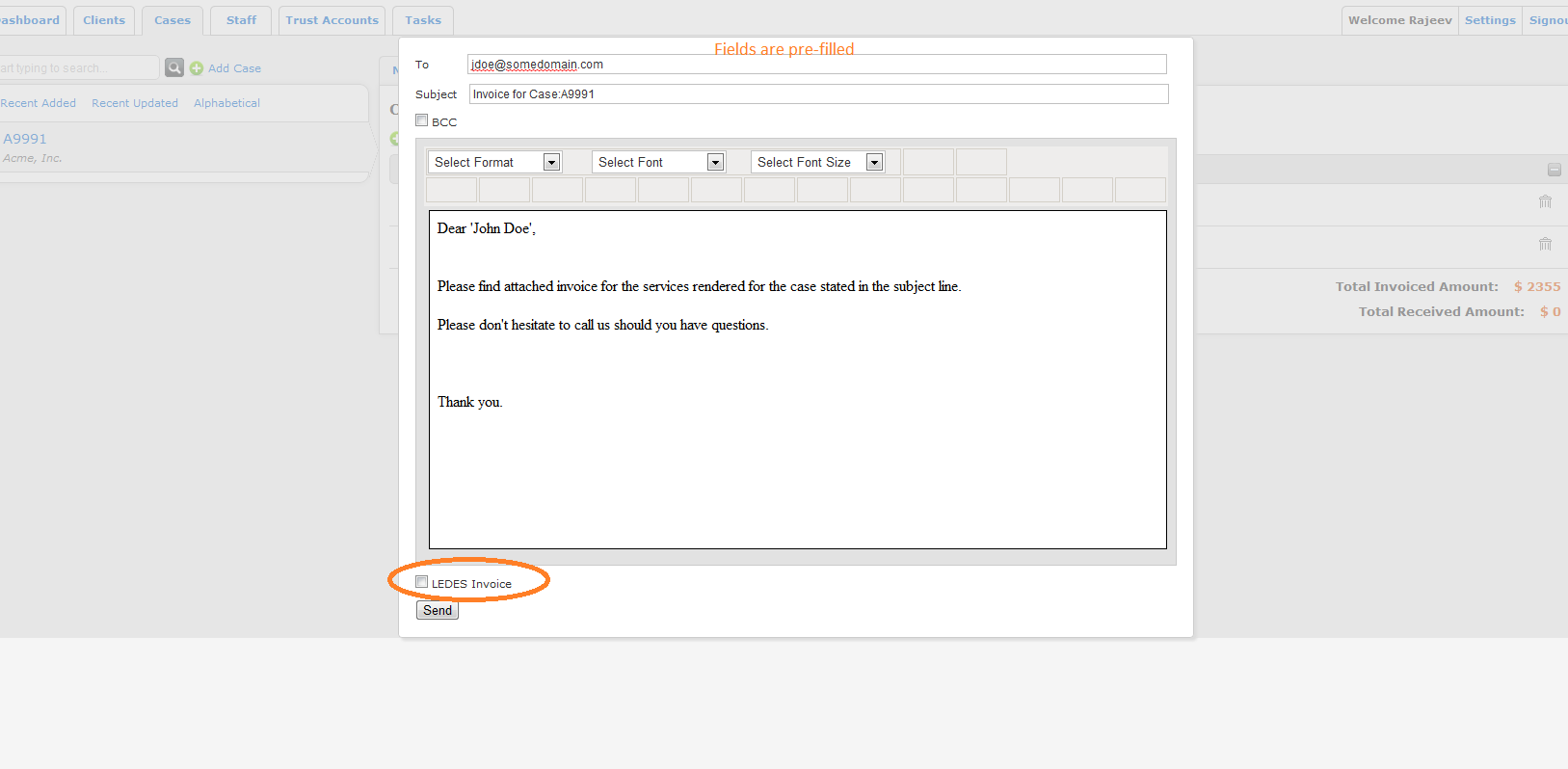 2. Enable/Disable Trust Fund Balance on Invoices: Invoice will show the payment to be deducted from client trust account (if funds are available) and balance payable by client (or zero if the trust funds are sufficient to pay the whole invoiced amount). If there is still a leftover amount in the trust account, the invoice will list that amount.
