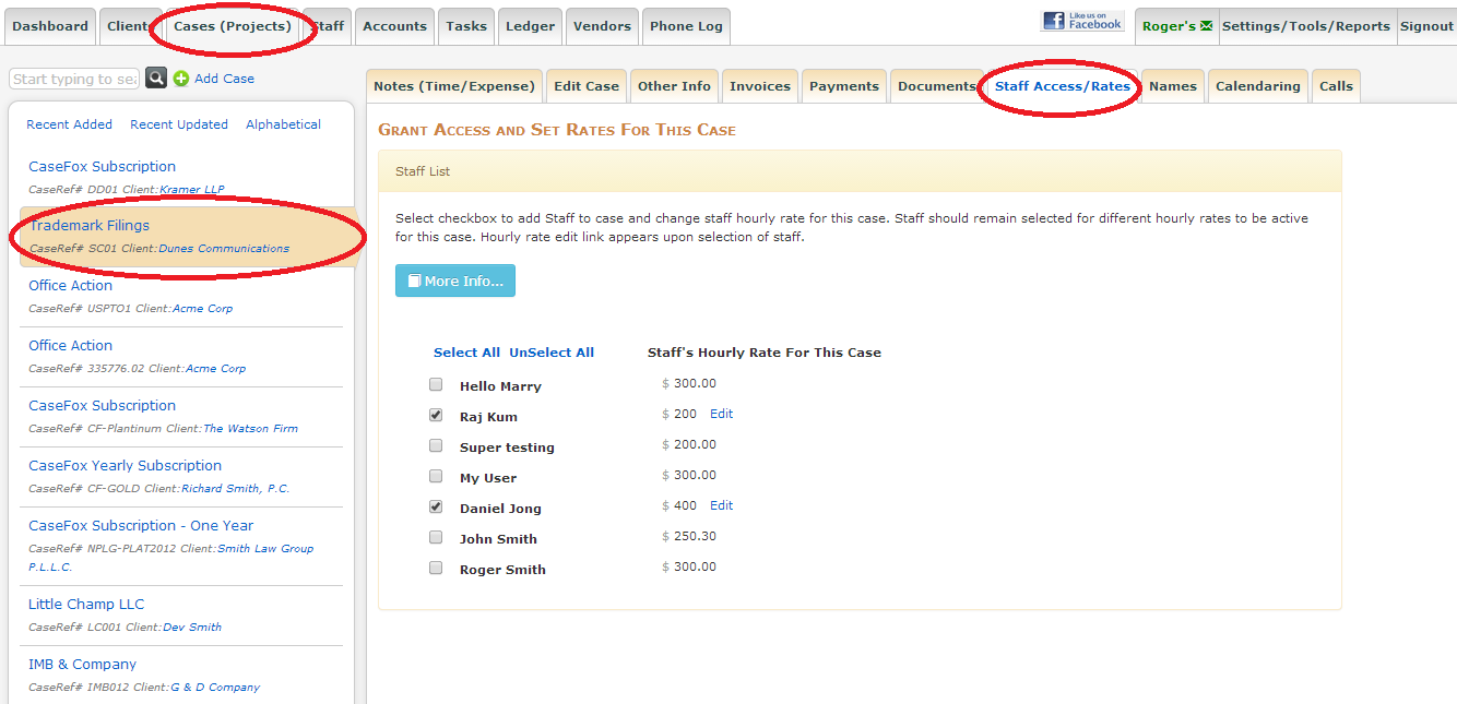 Click on the Cases (Projects) tab on the top of the page. In the left panel, select a desired case. On the right side panel, click on "Staff Access/Rates" tab. On the screen, check the checkbox in front of a staff name. An "Edit" link will appear. Click on that link to enter a new rate. Click Update. This process will do two things, first, if the selected staff is not an administrator, the selected staff will now have access to this case (administrators have access to all cases automatically). Second, a new hourly rate (only for this case) for the selected staff will be set.