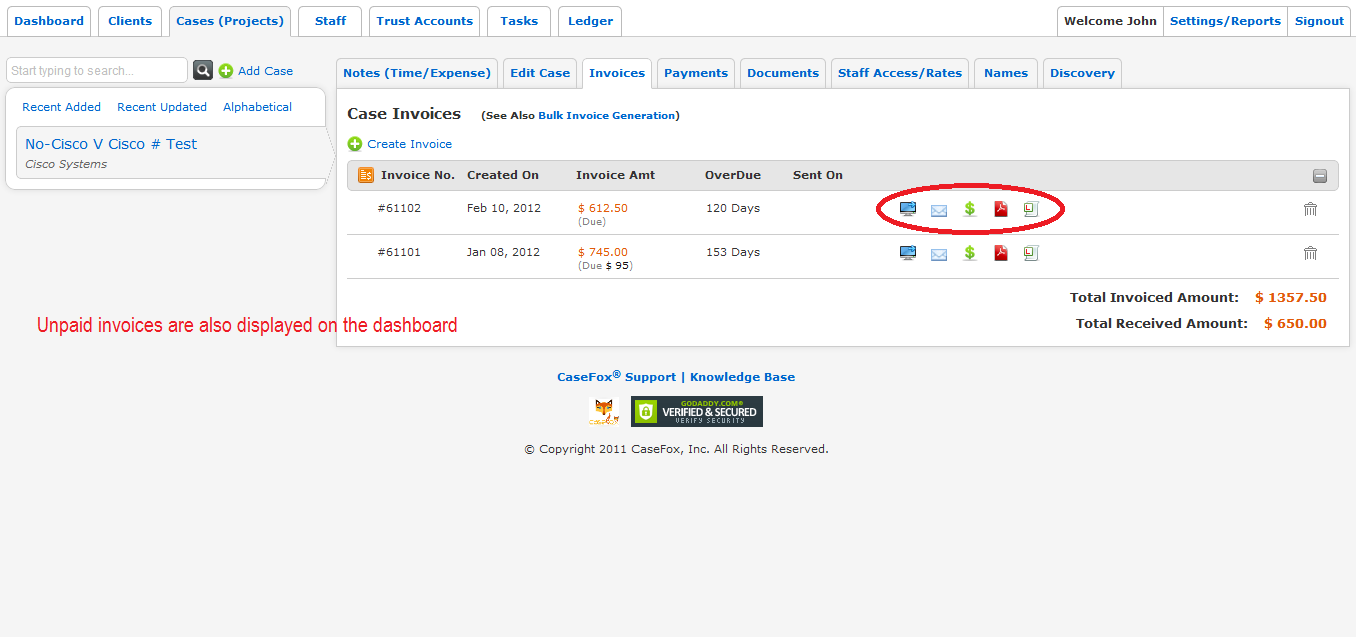 CaseFox offers various settings to format PDF invoices according to your needs. Keep in mind, there is no need to regenerate invoices after making changes to any of these properties. After making changes to one or more of these properties, you may go back to the invoice list and click on the PDF icon against a desired invoice to download updated invoice.