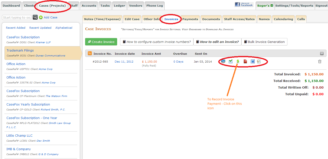 1. Advance Payments: If you have received an advance payment prior to issuing an invoice (and if the funds do not belong to a trust account), after generating the invoice as usual, click on the green dollar sign to record the received payment. Then click on the PDF icon to down the invoice. The invoice will reflect the received payment.
