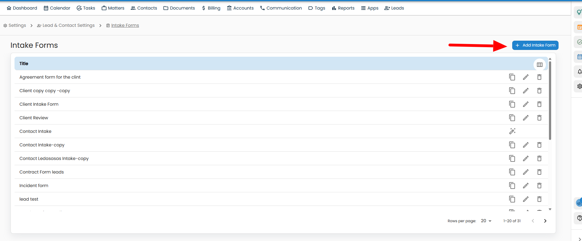 3. Click the Add Intake Form button in the top-right corner.