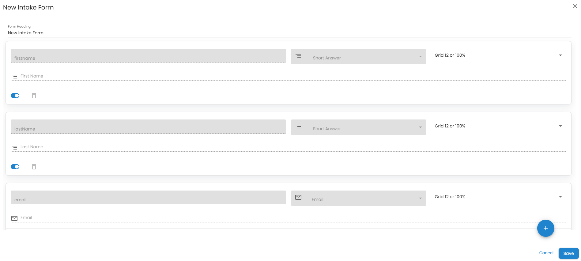 4. A form will open. Enter the Form Title (e.g., Client Intake, Contact Intake) and add the desired fields (such as Name, Phone, Email, etc.).