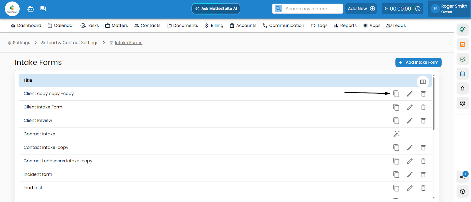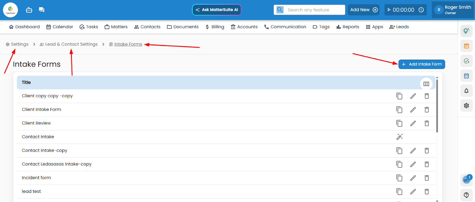 Go to the Settings tab from the top navigation bar. Select Lead & Contact Settings. Click on Intake Forms.