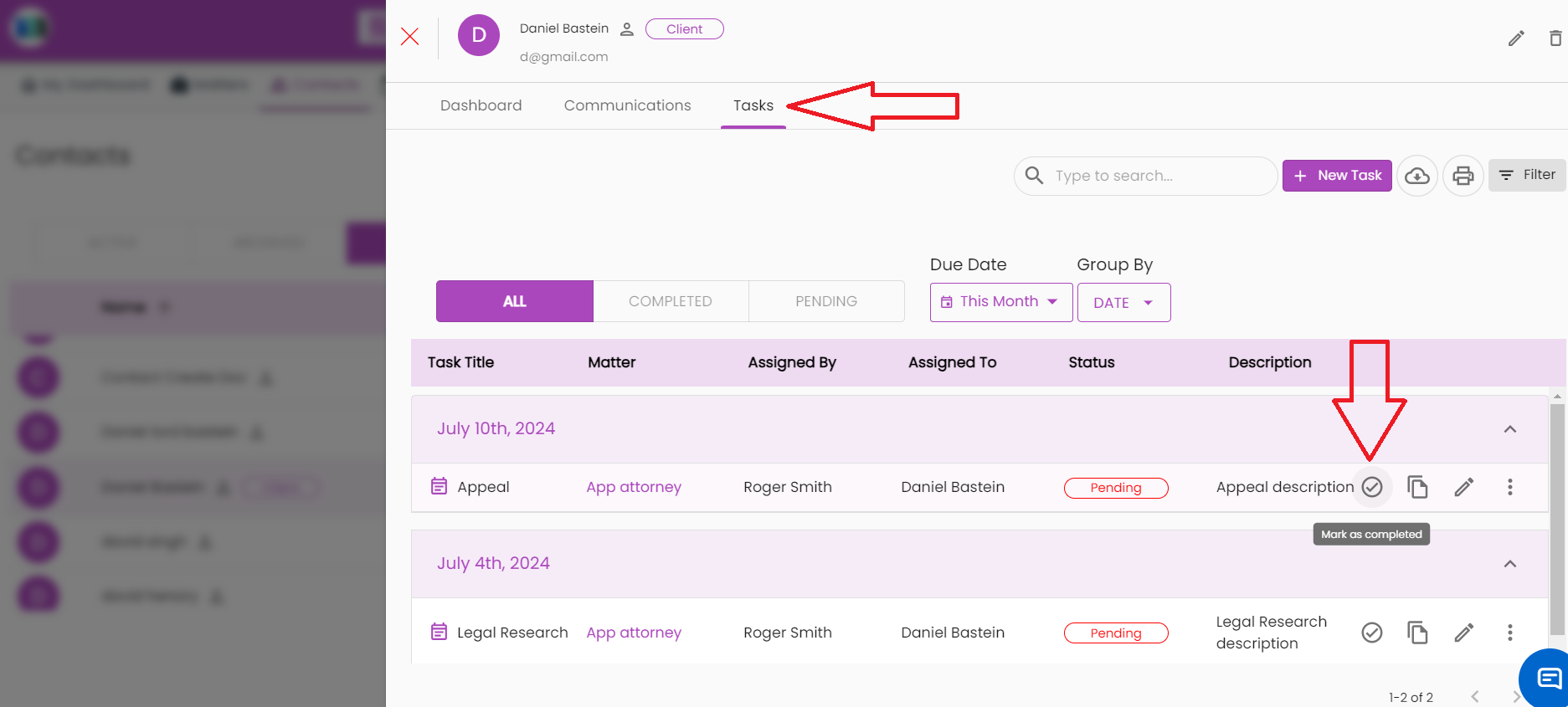 1. Click on the Contacts tab present on the nap bar. 2- Click on the contact you want to check the completed tasks for, then click on tasks section. 3 - Goto to Tasks tab, click on the tick icon please in the front of the task to mark task as ...