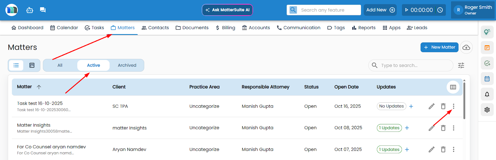Go to your MatterSuite Dashboard. Navigate to the Matters section. Click on the Add New Matter button. Enter all the required details such as client name, description, and case type. Click Save to successfully create your new matter. Refer to this ...