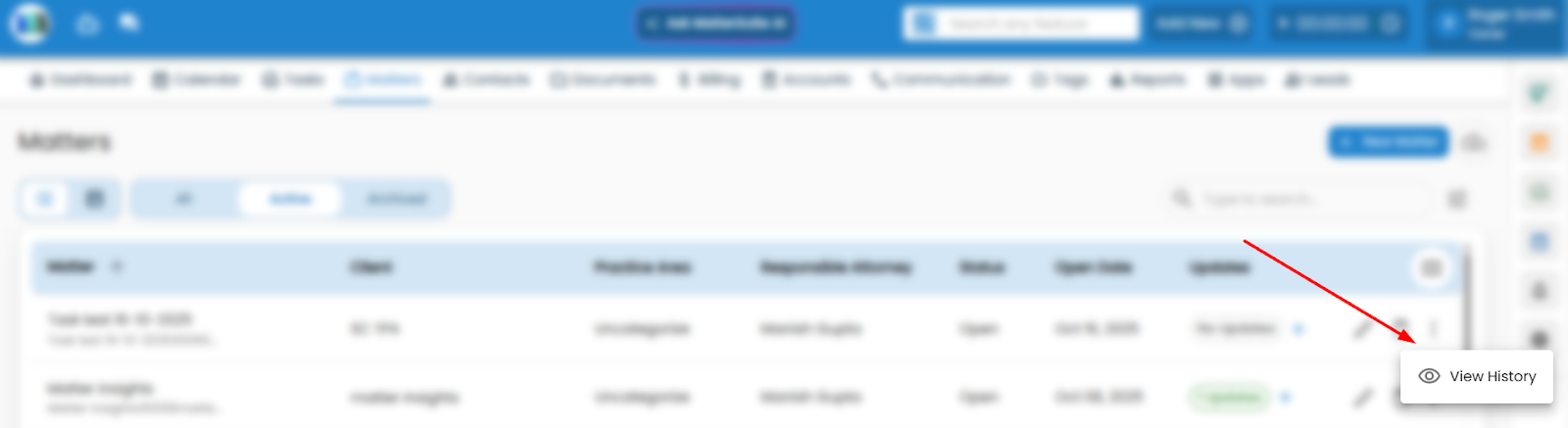 1. Click on the Matters tab present on the nap bar. 2. Click on the Matter for which you want to view the history. 3. Click on the Eye icon present on the upper-right corner of the window, to view the history.