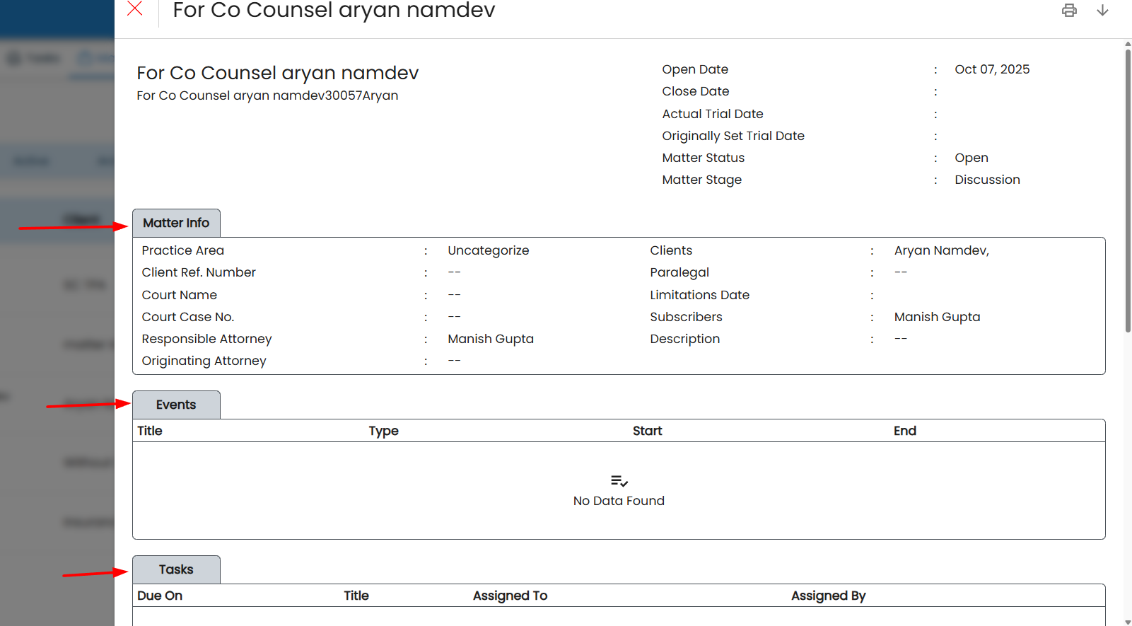 Steps: Click on the “Clients” tab on your dashboard. Select the client whose details you want to view. You’ll see client information, including contact details and case history. Scroll down to view linked matters and recent activity. You can click on ...
