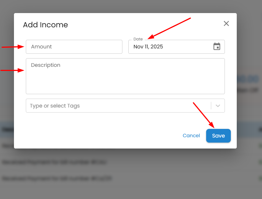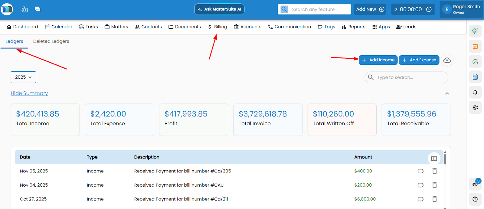 Go to Billing → Ledgers. Click Add Expense on the top-right. Enter the relevant expense information. Click Save to add the expense record.