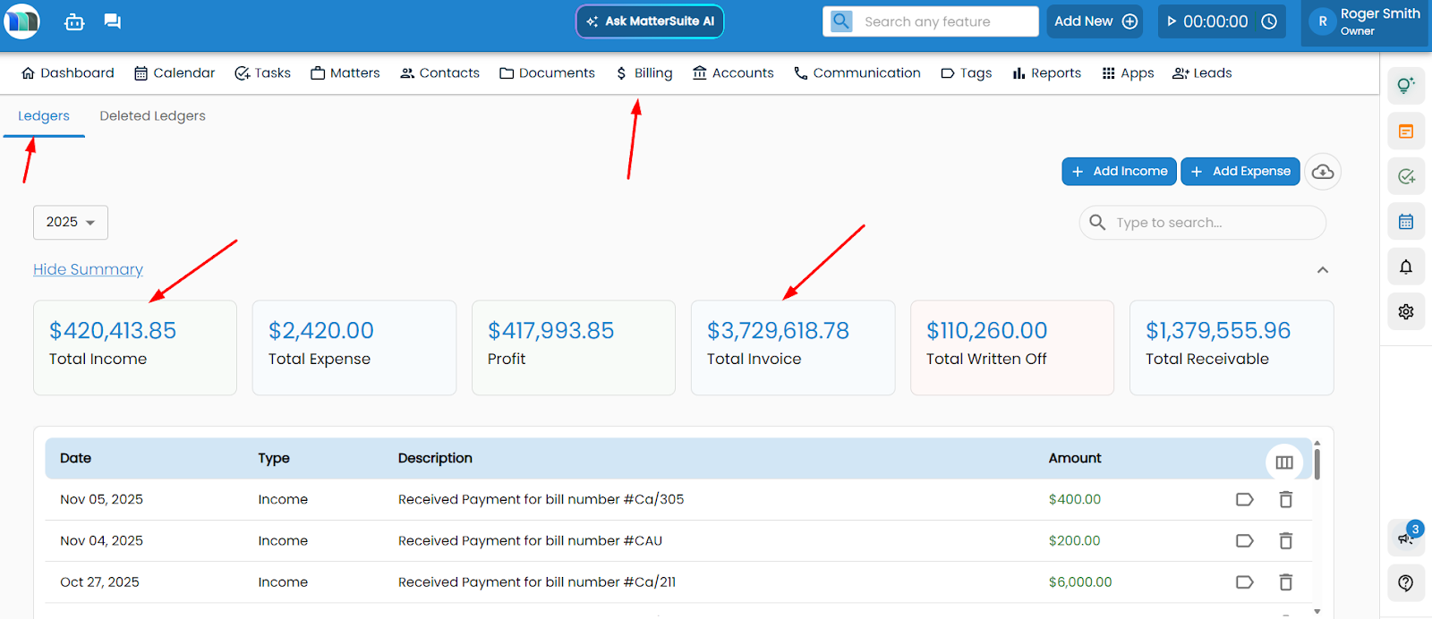 In the ledger table, find the entry. Click the Delete beside it. Confirm deletion when prompted Deleted transactions move to the Deleted Ledgers tab for reference.