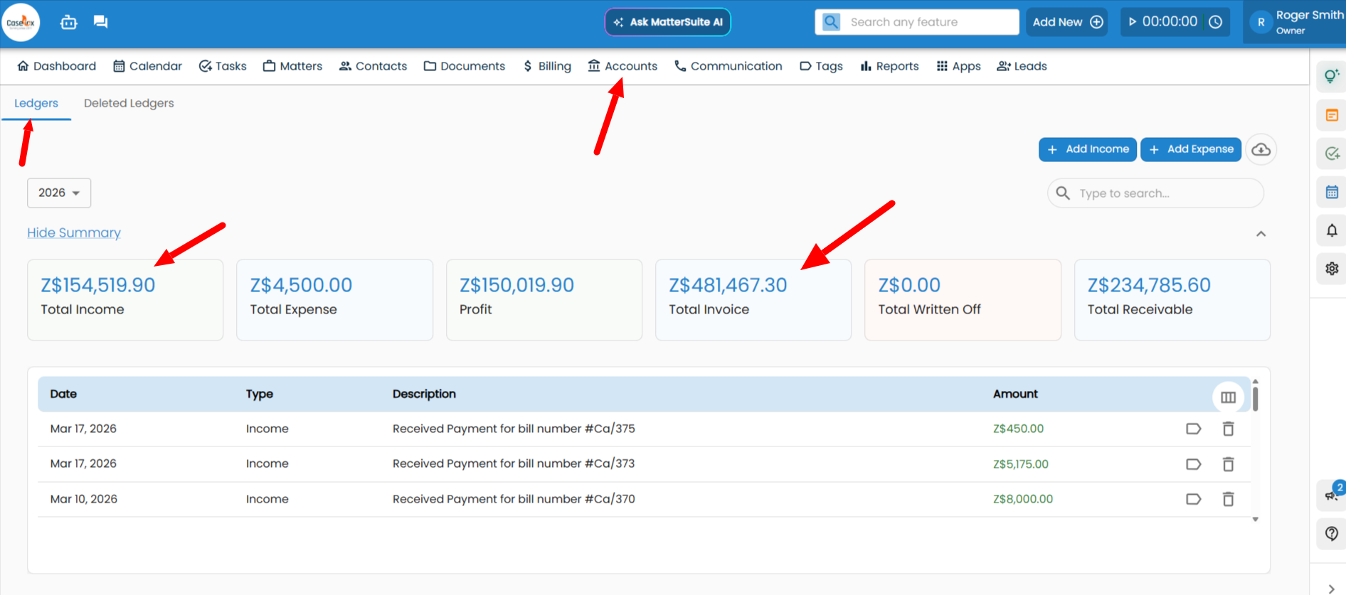 - When a payment is recorded, the payment is added to Total Income, and the amount is deducted from Total Receivable.