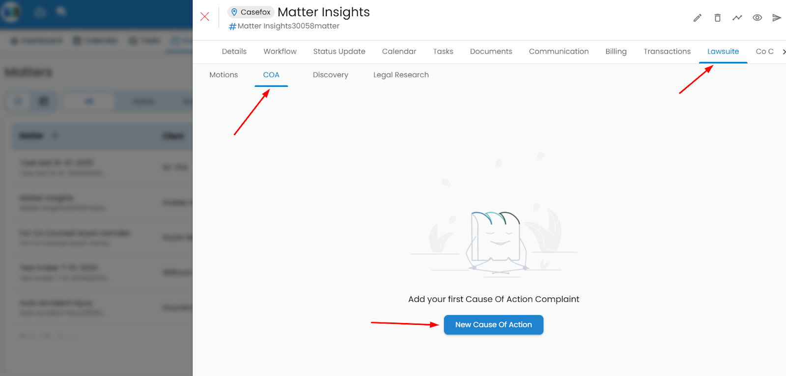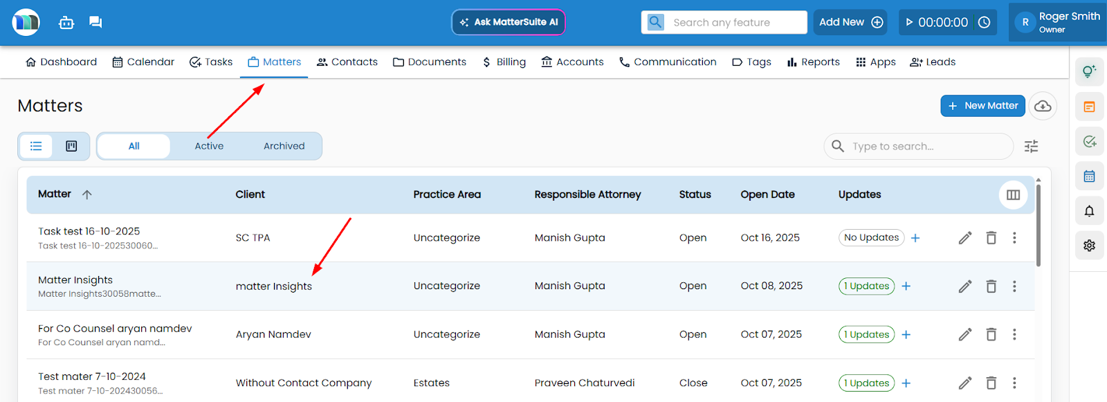 Go to your MatterSuite Dashboard. Navigate to the Matters section. Click on the Add New Matter button. Enter all the required details such as client name, description, and case type. Click Save to successfully create your new matter. Refer to this ...