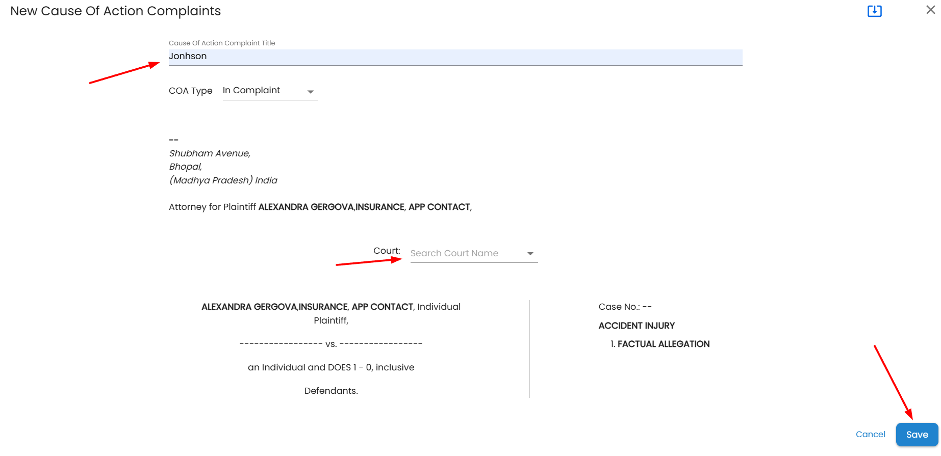 Choose your complaint title, fill in the details, and click Save. Refer to the image below