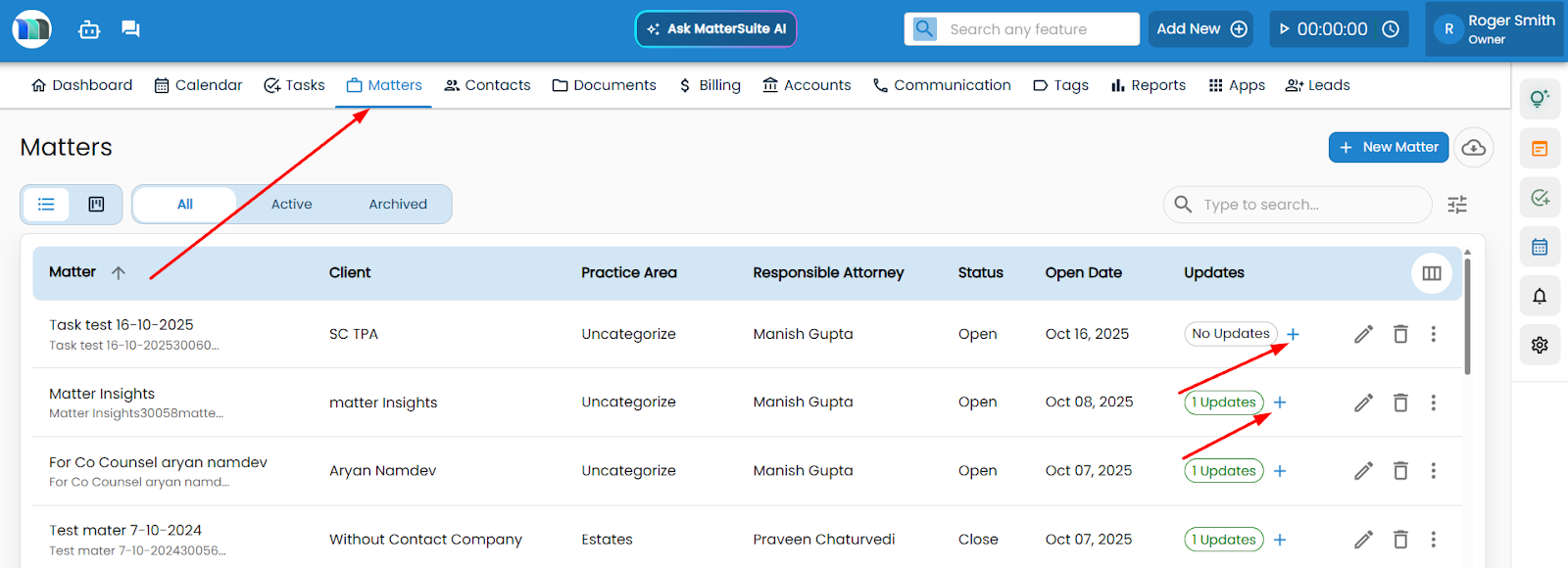 Go to your MatterSuite Dashboard. Navigate to the Matters section. Click on the Add New Matter button. Enter all the required details such as client name, description, and case type. Click Save to successfully create your new matter. Refer to this ...