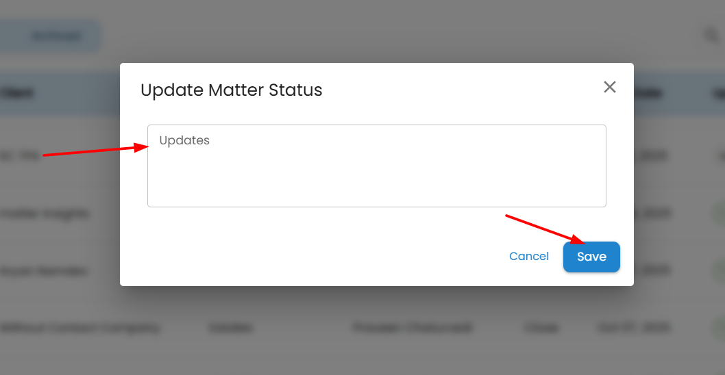Click on the “+” icon, add your update details, and click Save. Refer to the image below.