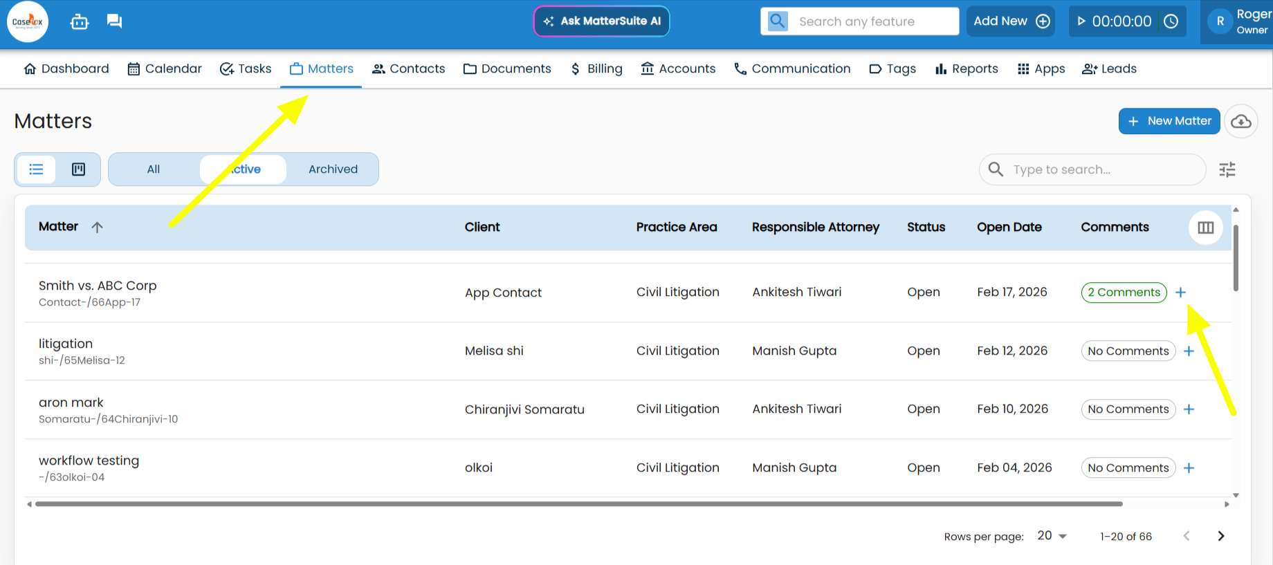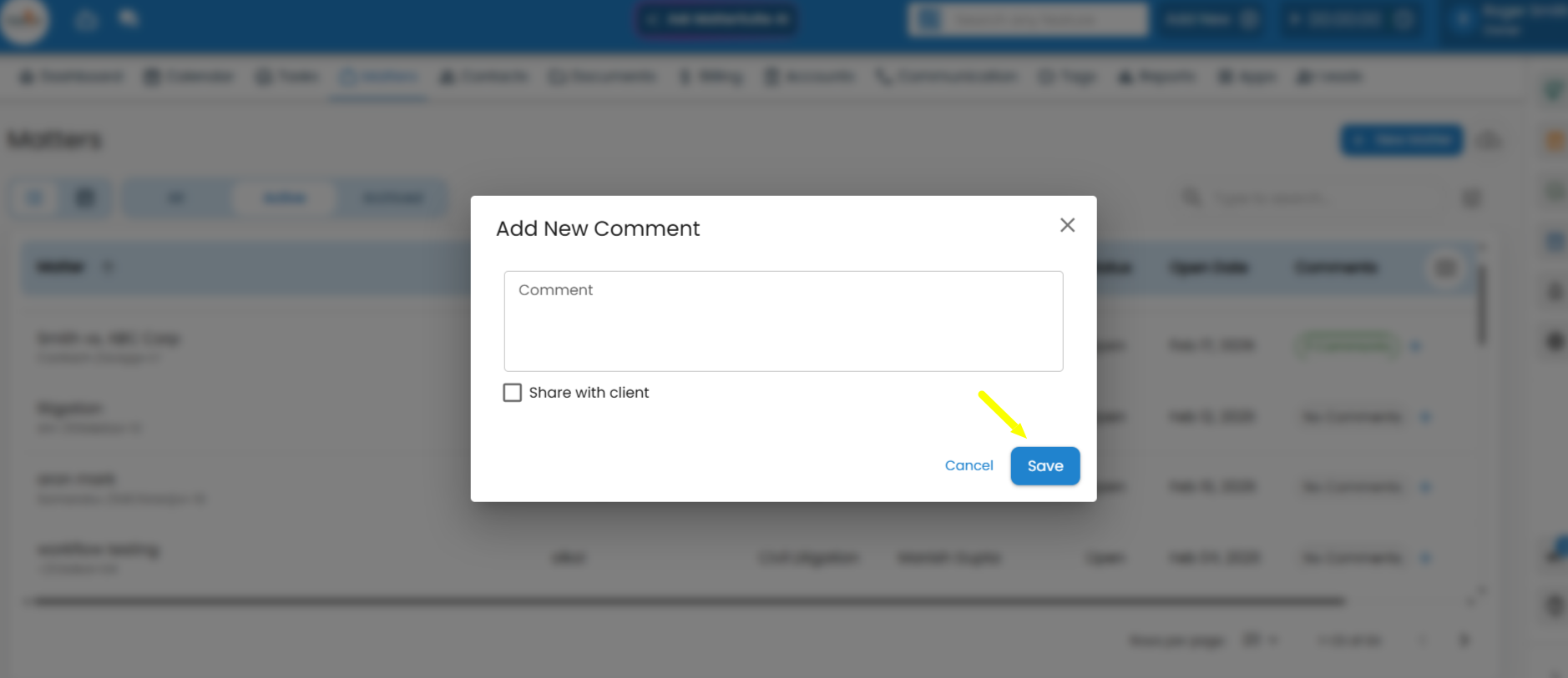 1. Go to your MatterSuite Dashboard. 2. Navigate to the Matters section. 3. Click on the Add New Matter button. 4. Enter all the required details such as client name, description, and case type. 5. Click Save to successfully create your new matter. ...