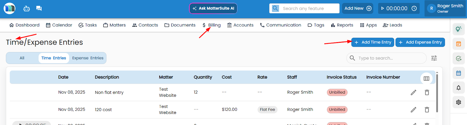 Go to Billing → Ledgers. Click Add Income on the top-right. Enter the transaction details (date, description, amount, and related matter if needed). Click Save to record the income.