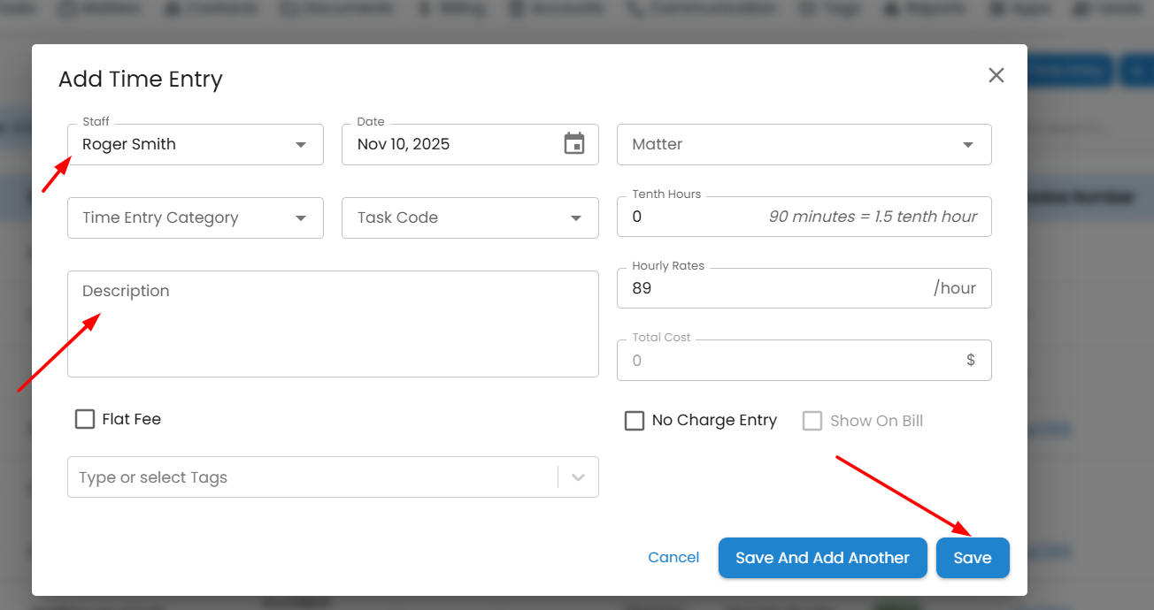 When the pop-up appears, enter all required details such as date, duration, description, and matter (if needed).