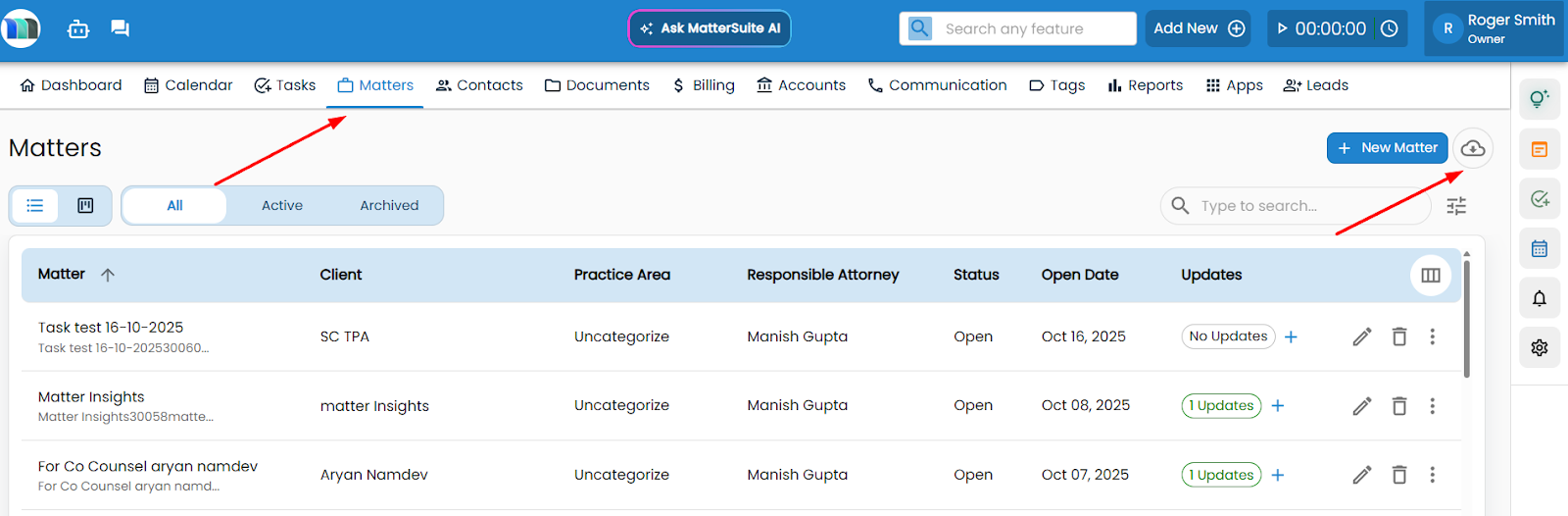Go to your MatterSuite Dashboard. Navigate to the Matters section. Click on the Add New Matter button. Enter all the required details such as client name, description, and case type. Click Save to successfully create your new matter. Refer to this ...