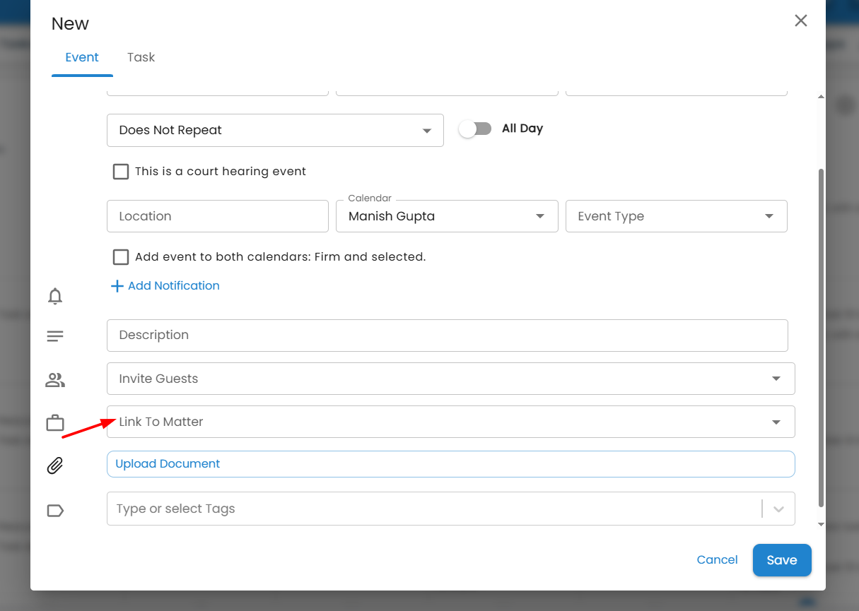 Open Calendar → click Add Event. Enter title, date, time, and location. Click Link to Matter and choose the case. (Optional) Add participants and upload documents. Set a reminder if needed → Save.