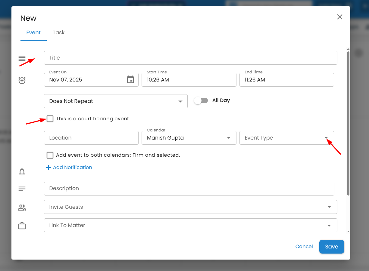 1. Click on the Matters tab present on the nap bar. 2. Select the matter for which you want to add a hearing calendar. 3. Click on the Calendar tab appearing on the screen and then click on the "New Event" button. 4. Add your details, and mark (tick) ...