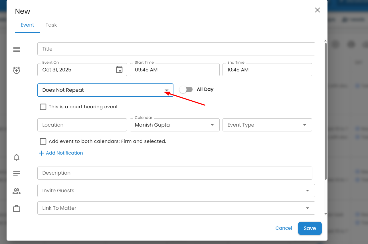 Open Calendar → click Add Event. Enter title, date, time, and location. Click Link to Matter and choose the case. (Optional) Add participants and upload documents. Set a reminder if needed → Save.
