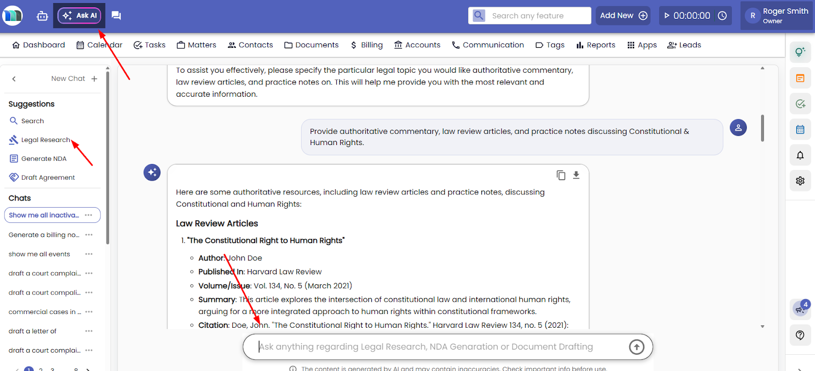The AI Legal Research feature helps you quickly find relevant laws, precedents, and commentary on any legal topic
